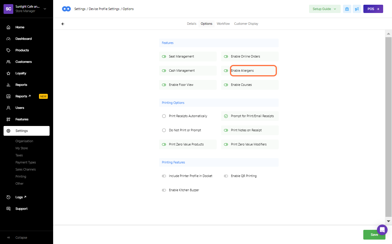 Allergen Warnings may only be required on specific devices, to continue the set-up, head to Settings, My Store, then Device Profiles