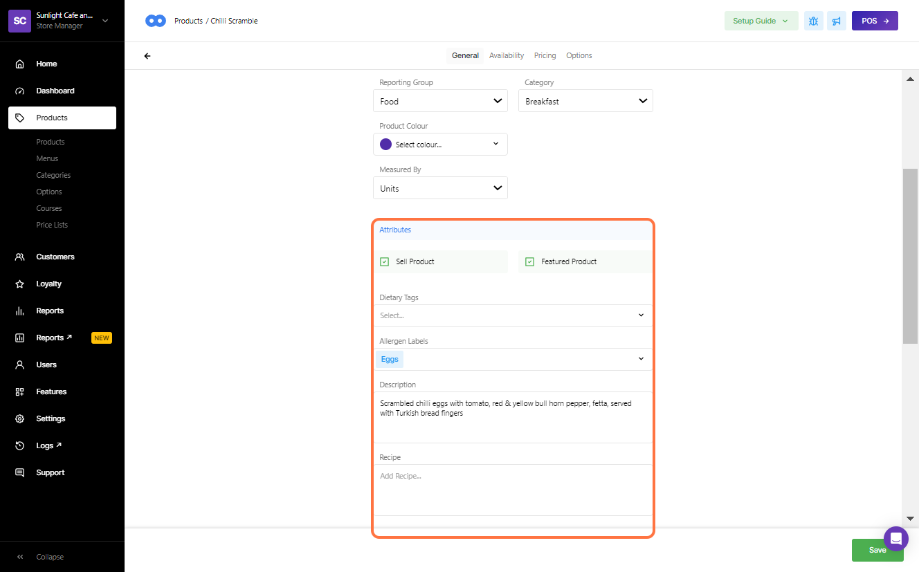 Once the feature has been enabled, under the Product Settings a new Allergens field will be displayed under Attributes