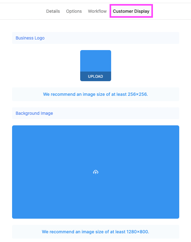 3. Under ' Customer Display ' => Upload your Logo & background image wanted for your CDS: