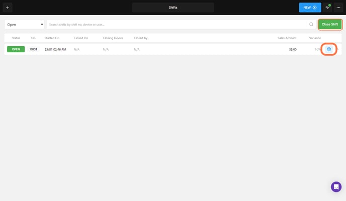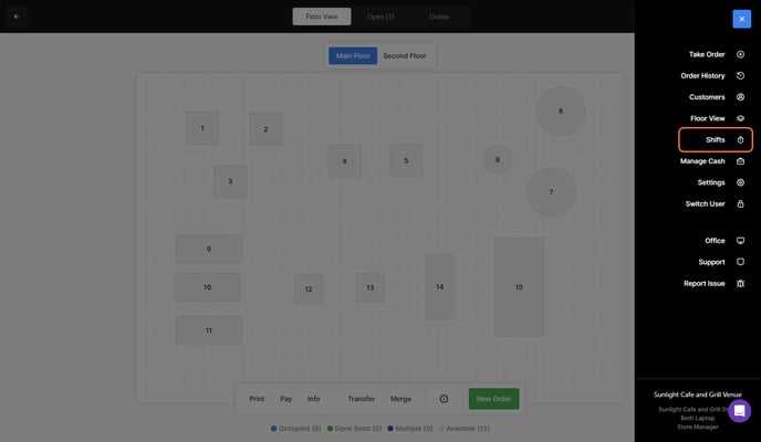 1. Navigate to Shifts screen on the POS by selecting the navigation bar icon on the top right of the screen.