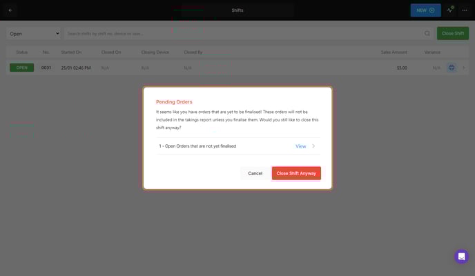 Shifts can be ended without finalising the open orders if needed. However, those sales will not be included in the shift report for that trading day.