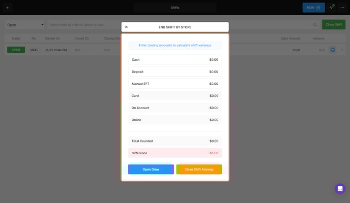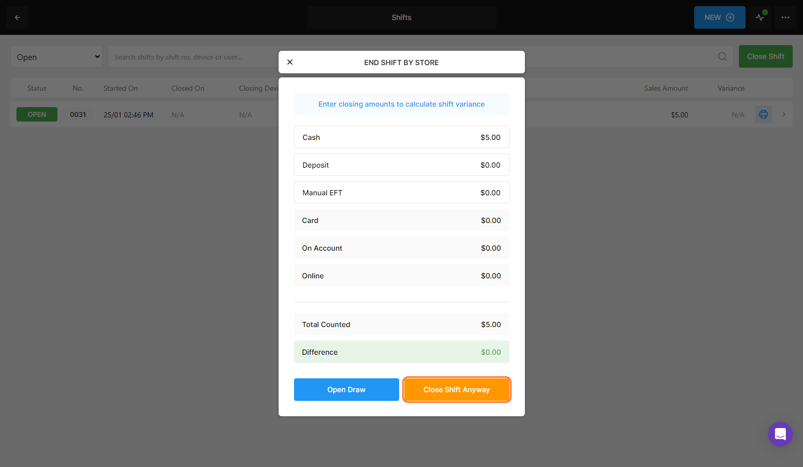 5. Once all fields have been filled, the Difference is expected to equate to $0.00. Continue by selecting Close Shift.