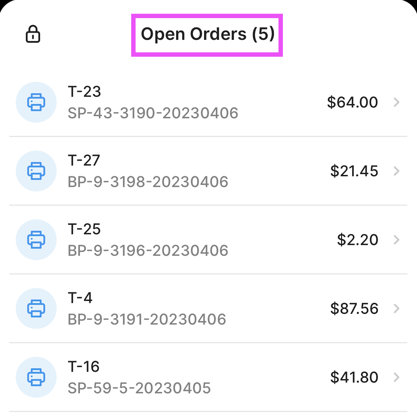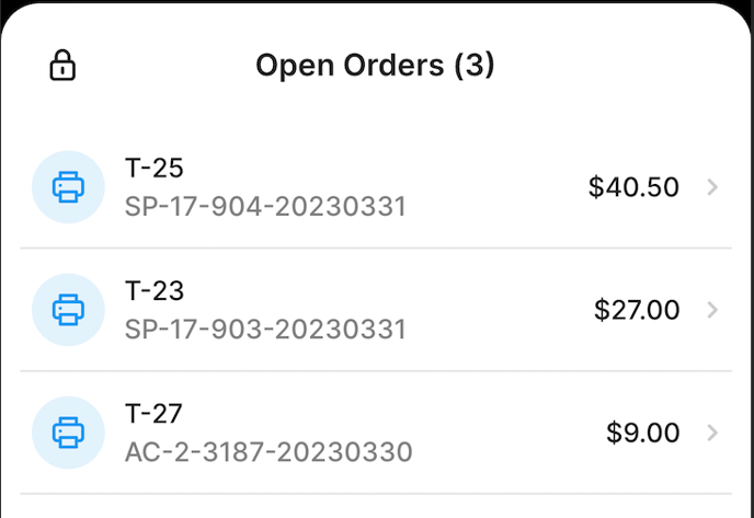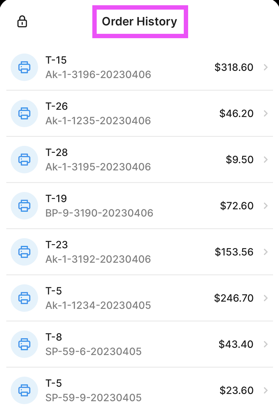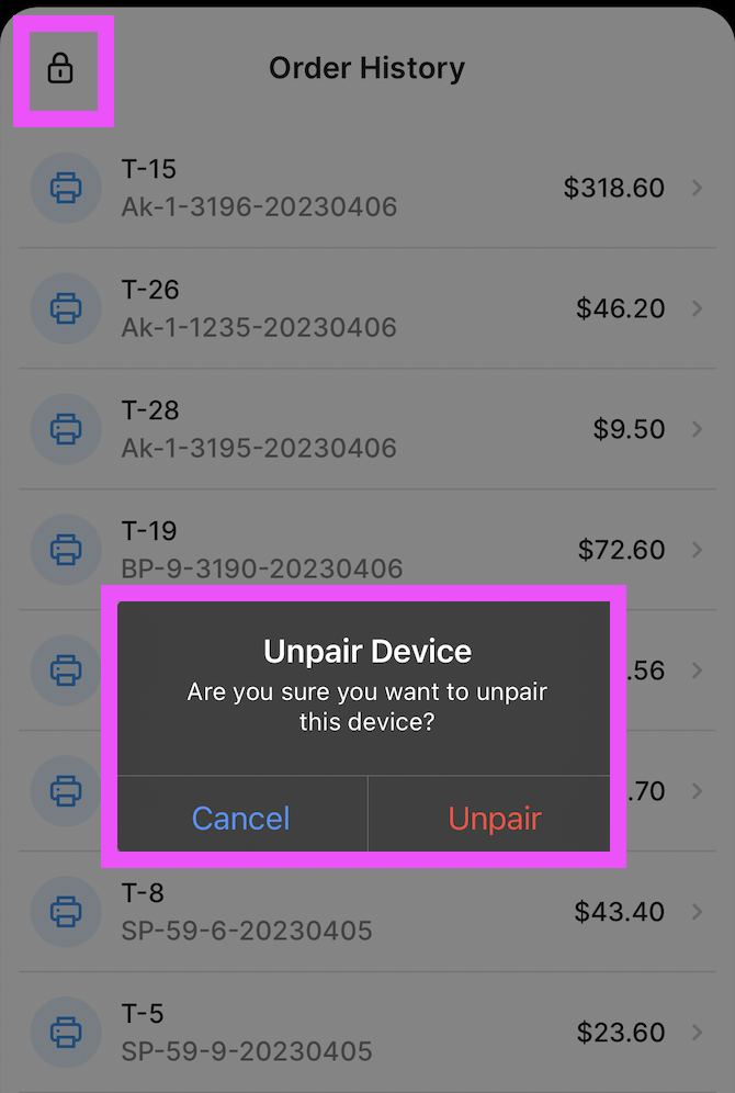 but in case you would like to unpair your MPOS, click on the ' Lock Icon ' on the top left of the screen in ' Order History ' or ' Open Orders ' :