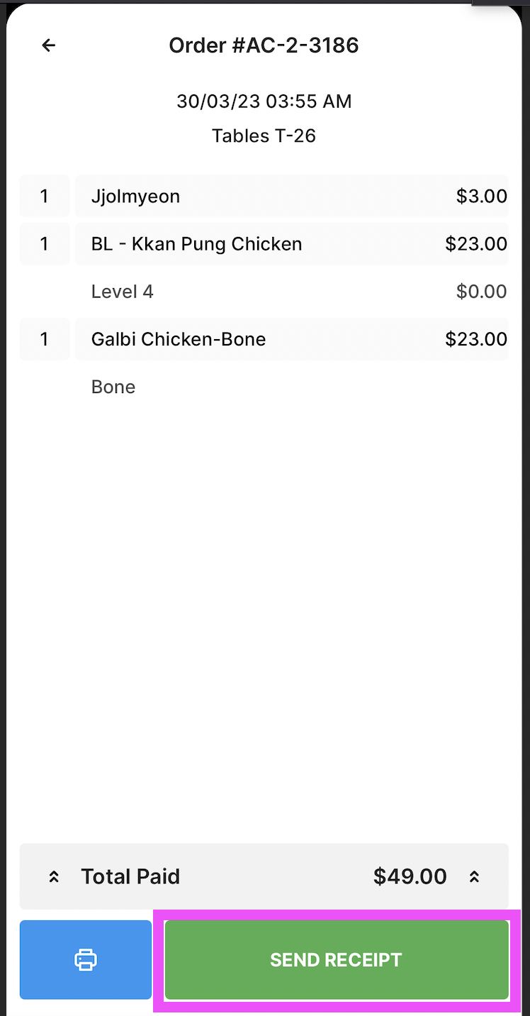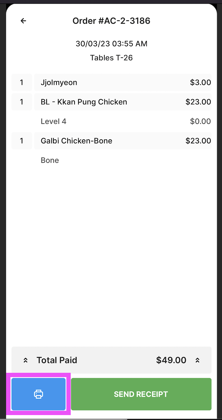 Click on the blue printer icon to reprint the receipt, the receipt will print to the printer you assigned in your Back Office for your MPOS Device.