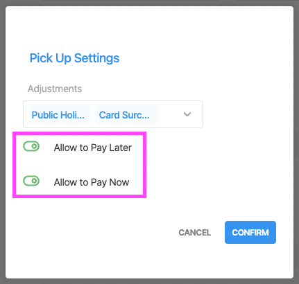 ' Allow to Pay Later ' : To allow your Customers to pay at the counter directly. This is a good option for: Dine In & Takeaway but wouldn't be recommended for Delivery, Pickup or Catering as you might want your customer to pre-pay.