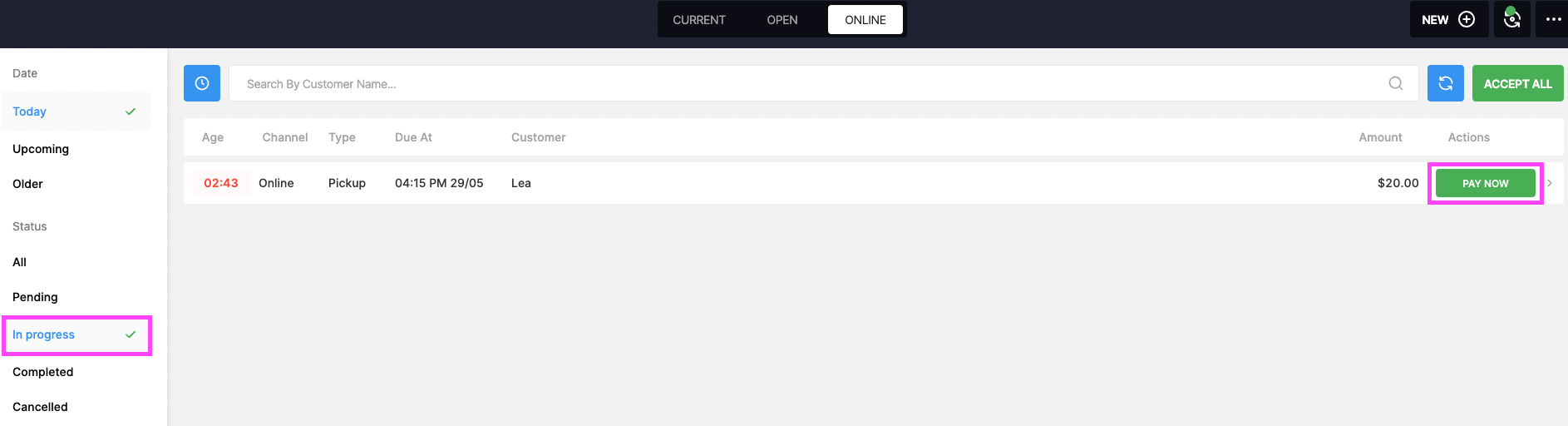 it will move automatically to ' In Progress ' where you can take the payment ' Pay Now ' :
