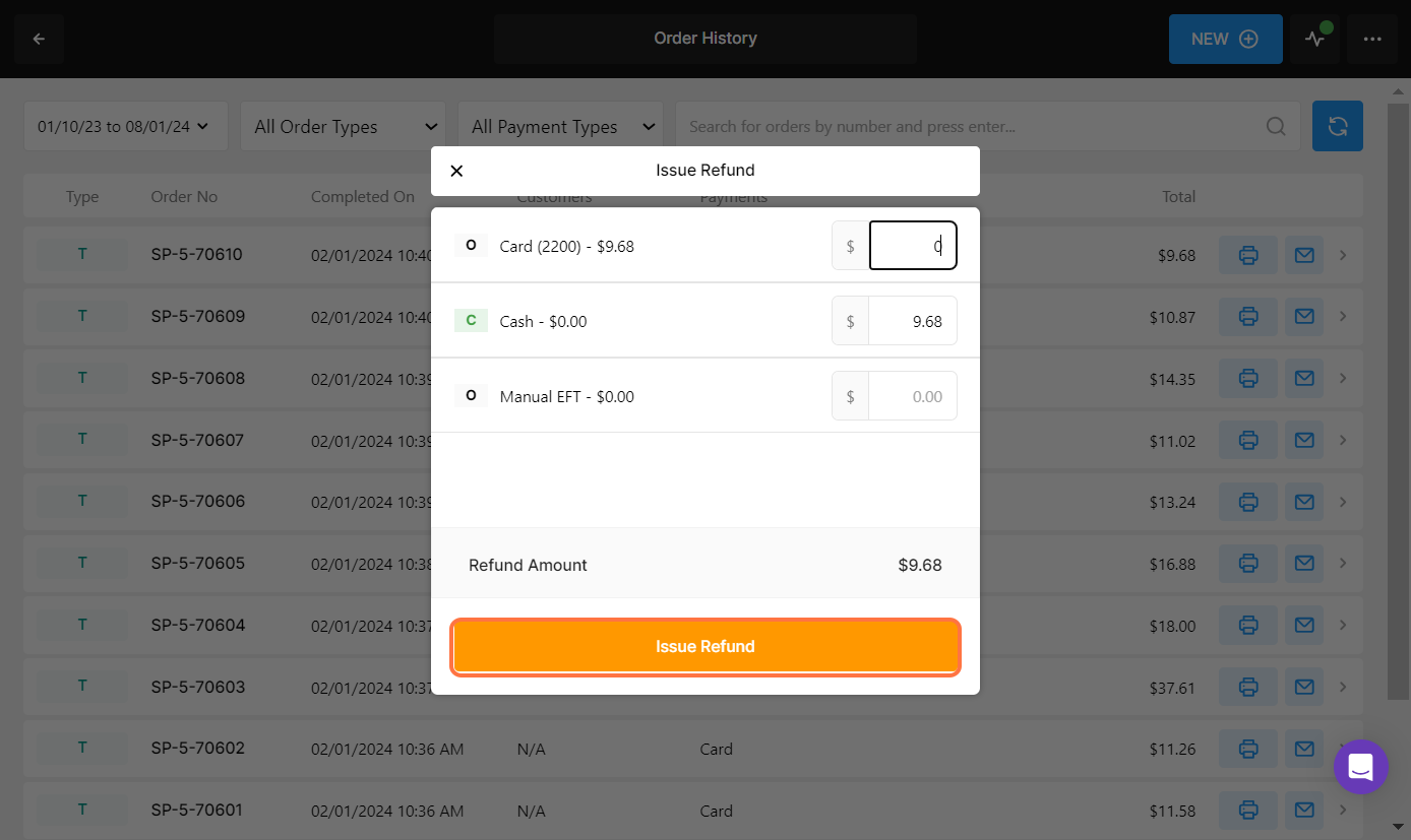 The Issue Refund Modal will then appear. Use the text boxes to enter the amount desired to refund next to each relevant payment type.