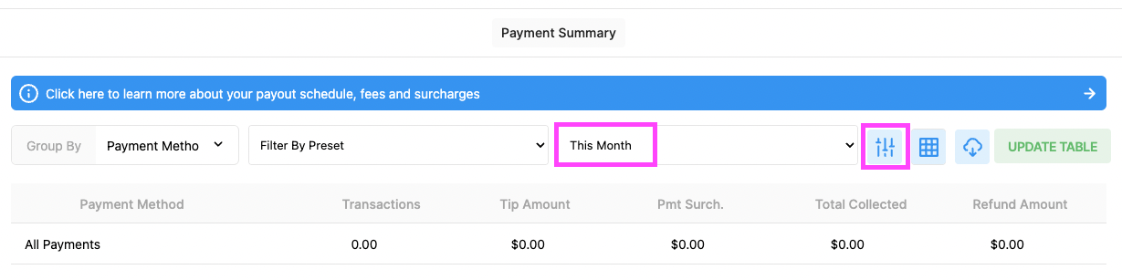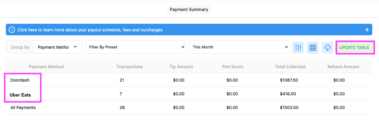 4. Click on ' Update Table ' to display your information with your filters applied => You can now see your Sales Channels ' Ubereats ' , ' Doordash ' displaying the Total Collected for the dates you choose :