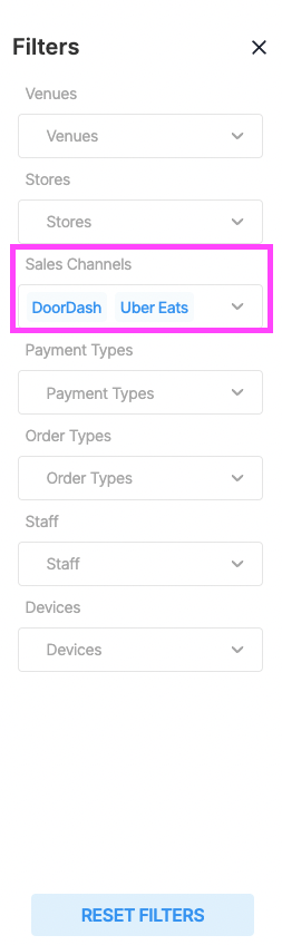 3. You can Filter your Sales Channels only choosing your ' DoorDash ' & / or ' Uber Eats ' options or filter by ' Payment Types ' :
