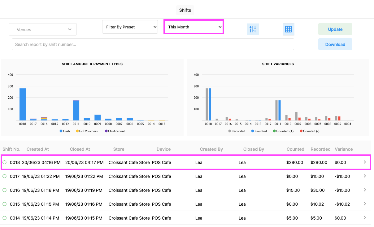 In your Back Office => Go to ' Reports ' => ' Shift Summaries ' :