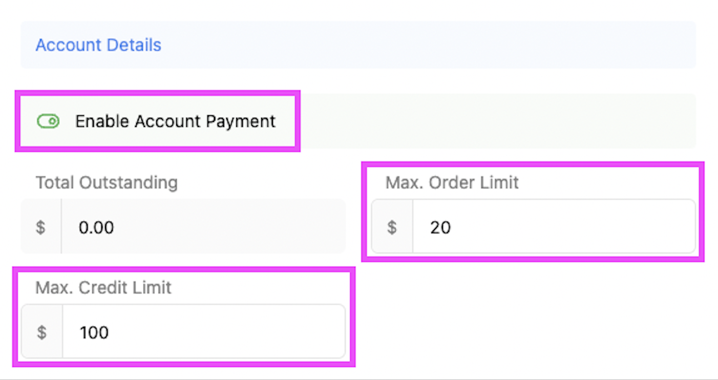 Max. Credit Limit: This is the maximum amount the customer can spend on the Account / Tab until they need to pay & reset the account