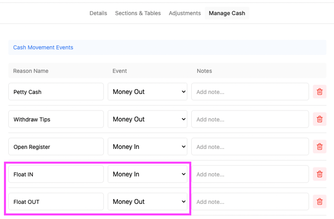 ( ex: ' Petty Cash ' would be a ' Money Out ' but ' Float IN ' would be a ' Money In ' event )