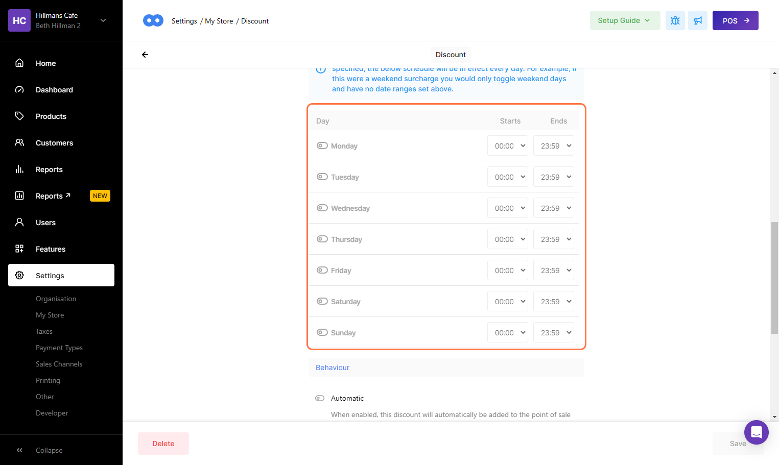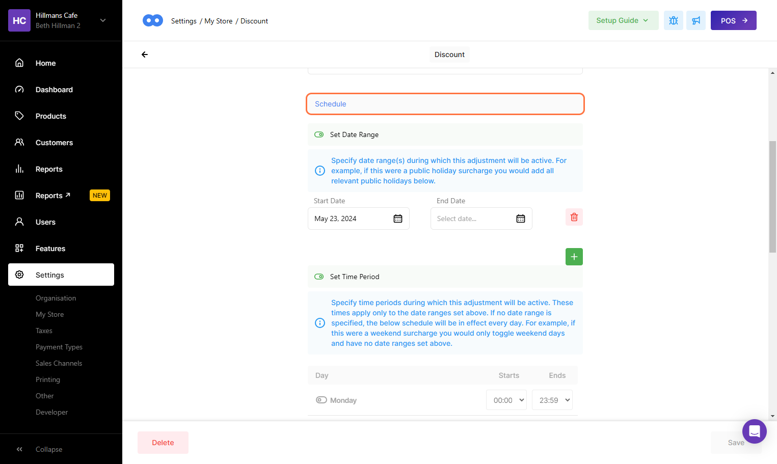 Oolio Platform also has the ability to schedule discounts on a yearly calendar, along with scheduling by time and day of the week.
