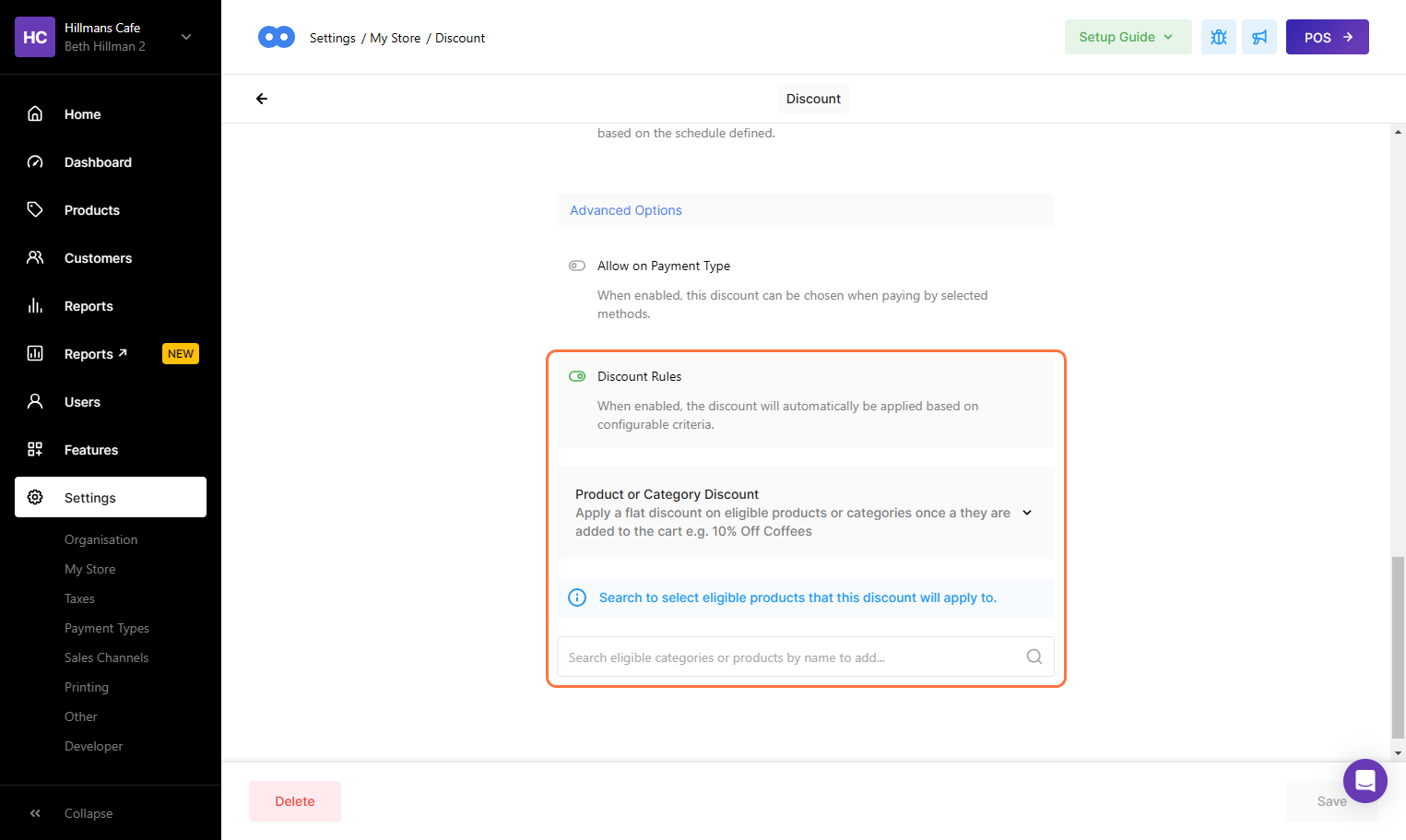Selecting Allow on Payment Type allows for the discount to only apply to specific payment types.