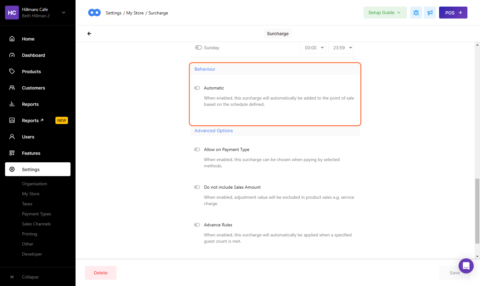To ensure a surcharge is applied automatically to the desired time period, select the Automatic Toggle