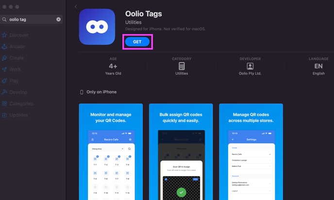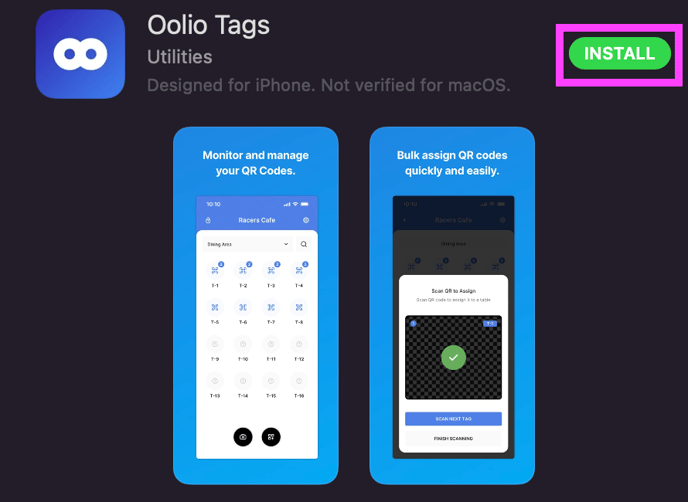 Go to your ' App Store ' => search for ' Oolio Tags ' => click on ' GET ' => ' INSTALL ' to install it on your phone :