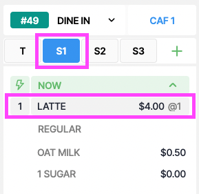 2. Latte is now assigned to Seat 1 => @1 next to the product indicates the Seat Number